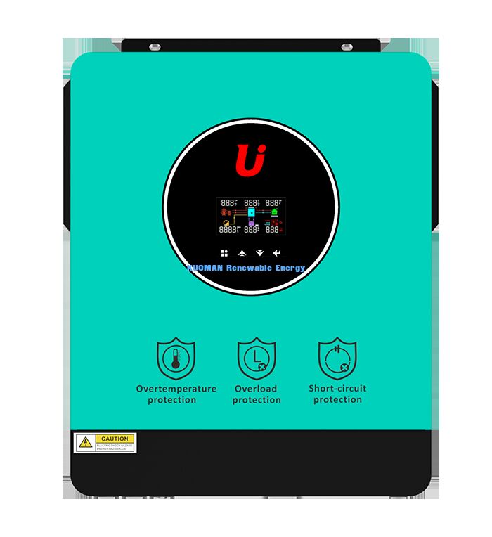Combining a solar inverter, battery charger, and AC transfer switch in one sleek, teal-and-black unit, it manages power from solar panels, the grid, and batteries seamlessly.